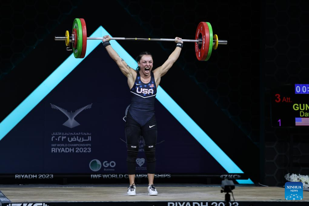 Danielle Gunnin of the United States competes during the women's 59 kg event at the 2023 World Weightlifting Championships in Riyadh, Saudi Arabia, Sept. 8, 2023. (Photo by Zeng Chen/Xinhua)