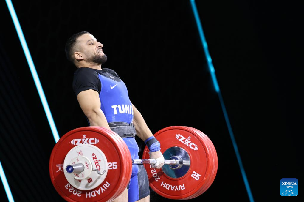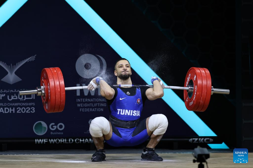 Hnia Karem Ben of Tunisia competes during the men's 73 kg event at the 2023 World Weightlifting Championships in Riyadh, Saudi Arabia, Sept. 9, 2023. (Photo by Zeng Chen/Xinhua)