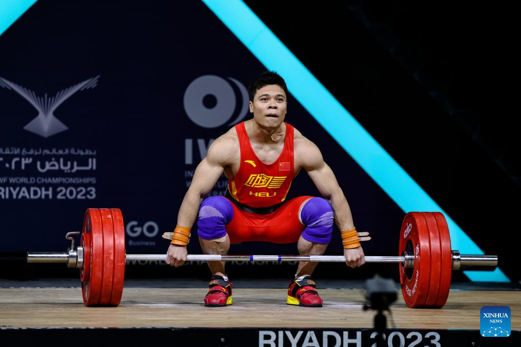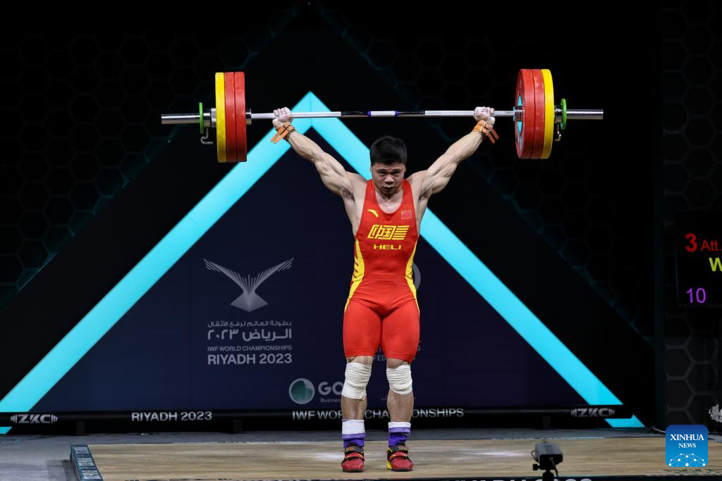 Wei Yinting of China competes during the men's 73 kg event at the 2023 World Weightlifting Championships in Riyadh, Saudi Arabia, Sept. 9, 2023. (Photo by Zeng Chen/Xinhua)
