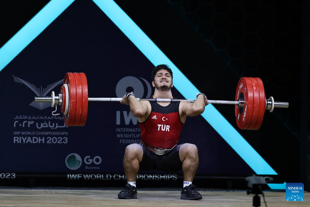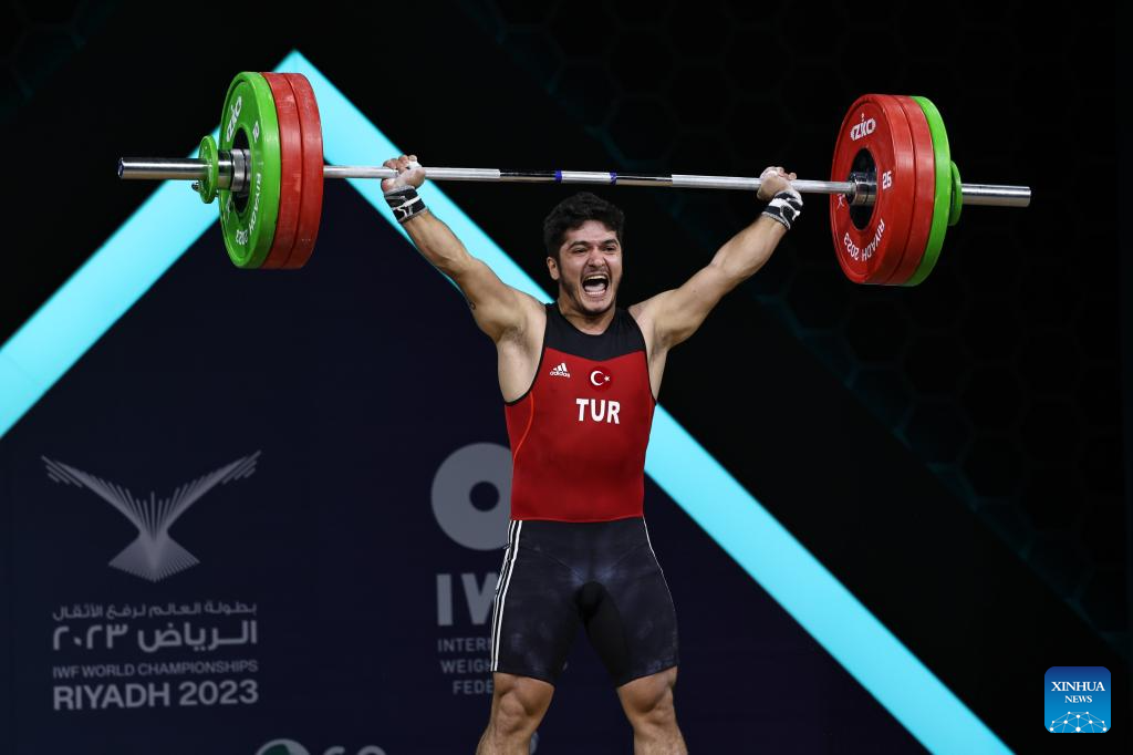 Muhammed Furkan Ozbek of Türkiye competes during the men's 73 kg event at the 2023 World Weightlifting Championships in Riyadh, Saudi Arabia, Sept. 9, 2023. (Photo by Zeng Chen/Xinhua)