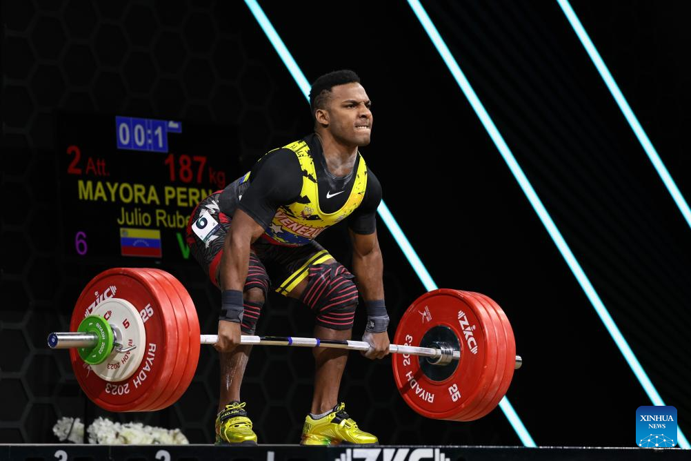 Julio Ruben Mayora Perna of Venezuela competes during the men's 73 kg event at the 2023 World Weightlifting Championships in Riyadh, Saudi Arabia, Sept. 9, 2023. (Photo by Zeng Chen/Xinhua)