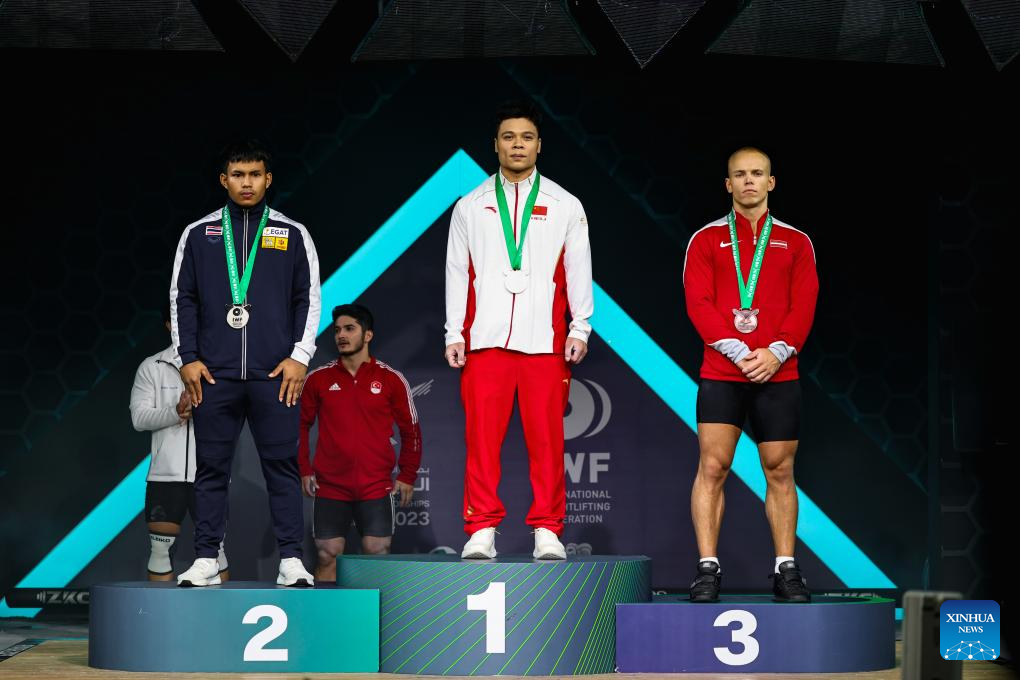 Gold medalist Wei Yinting (C), silver medalist Weeraphon Wichuma (L) of Thailand and bronze medalist Ritvars Suharevs of Latvia attend the awarding ceremony for the men's 73 kg snatch event at the 2023 World Weightlifting Championships in Riyadh, Saudi Arabia, Sept. 9, 2023. (Photo by Zeng Chen/Xinhua)