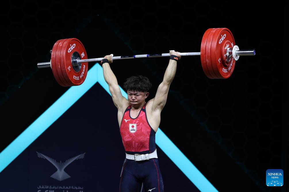 Konnai Mitsunori of Japan competes during the men's 73 kg event at the 2023 World Weightlifting Championships in Riyadh, Saudi Arabia, Sept. 9, 2023. (Photo by Zeng Chen/Xinhua)