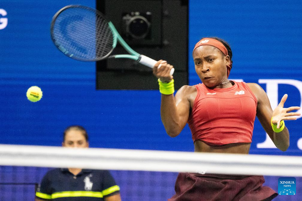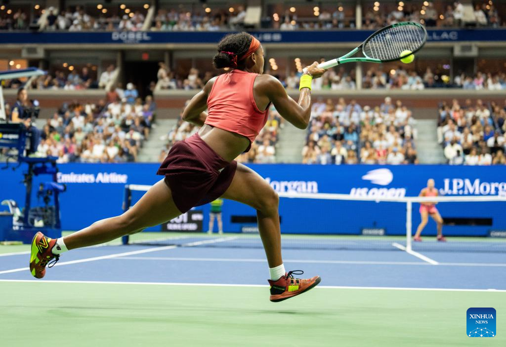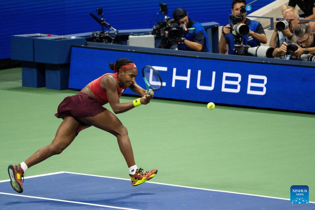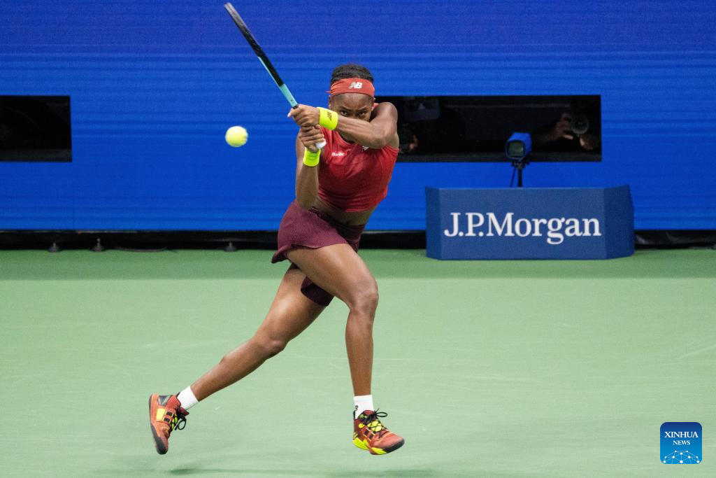 Coco Gauff of the United States hits a return during the women's singles final match against Aryna Sabalenka of Belarus at the 2023 US Open tennis championships in New York, the United States, on Sept. 9, 2023. (Xinhua/Liu Jie)