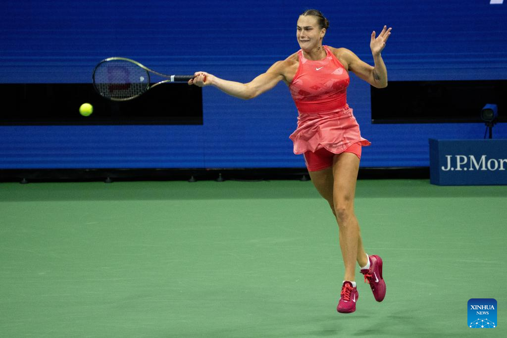 Aryna Sabalenka of Belarus hits a return during the women's singles final match against Coco Gauff of the United States at the 2023 US Open tennis championships in New York, the United States, on Sept. 9, 2023. (Xinhua/Liu Jie)