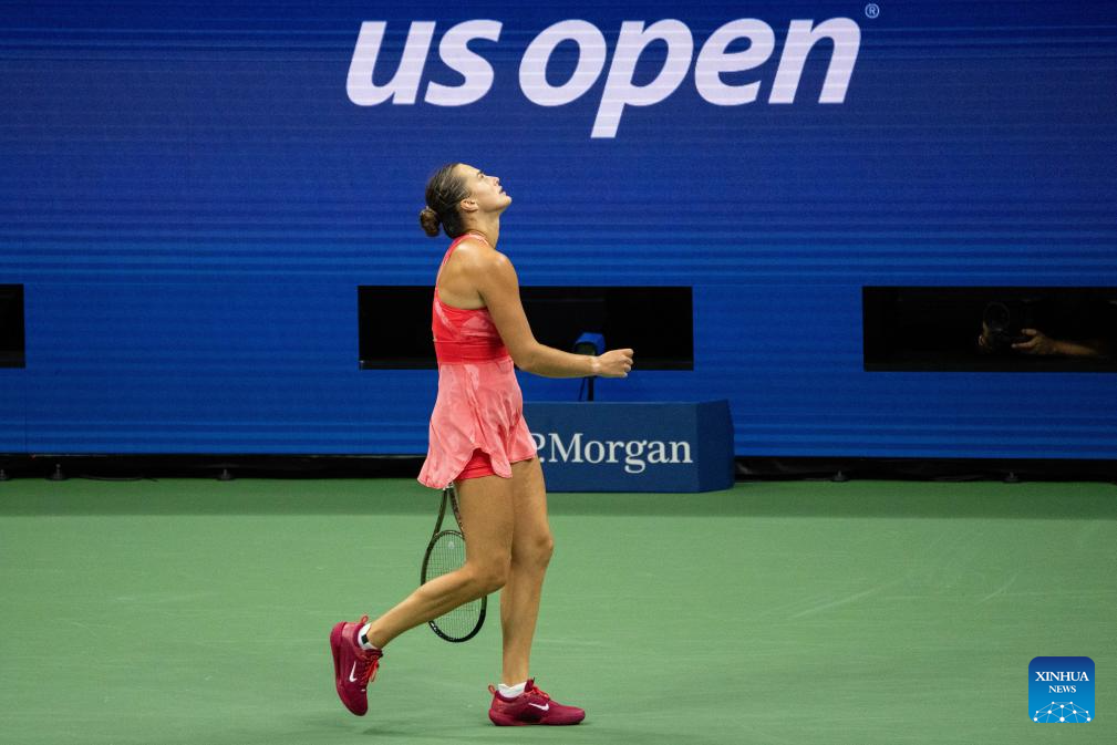 Aryna Sabalenka of Belarus reacts during the women's singles final match against Coco Gauff of the United States at the 2023 US Open tennis championships in New York, the United States, on Sept. 9, 2023. (Xinhua/Liu Jie)
