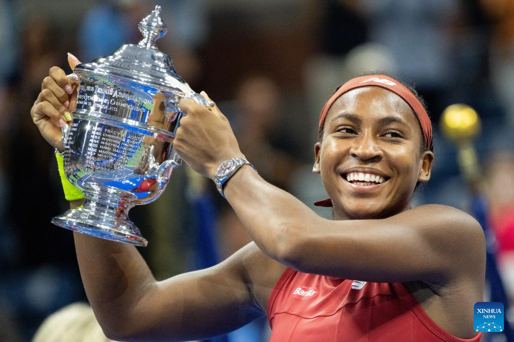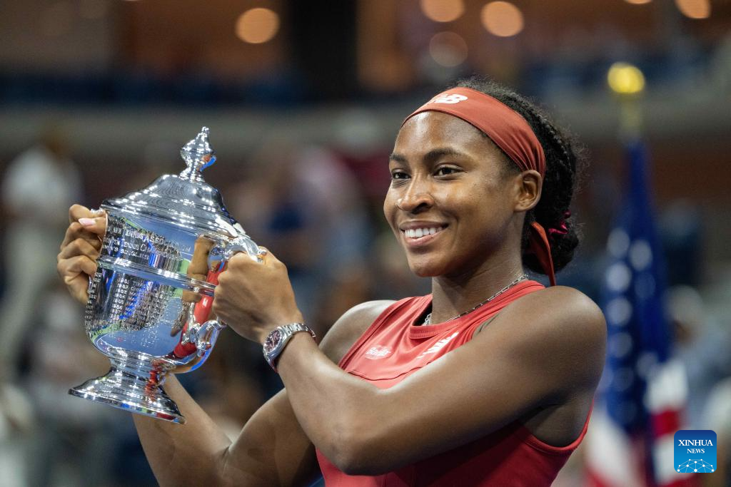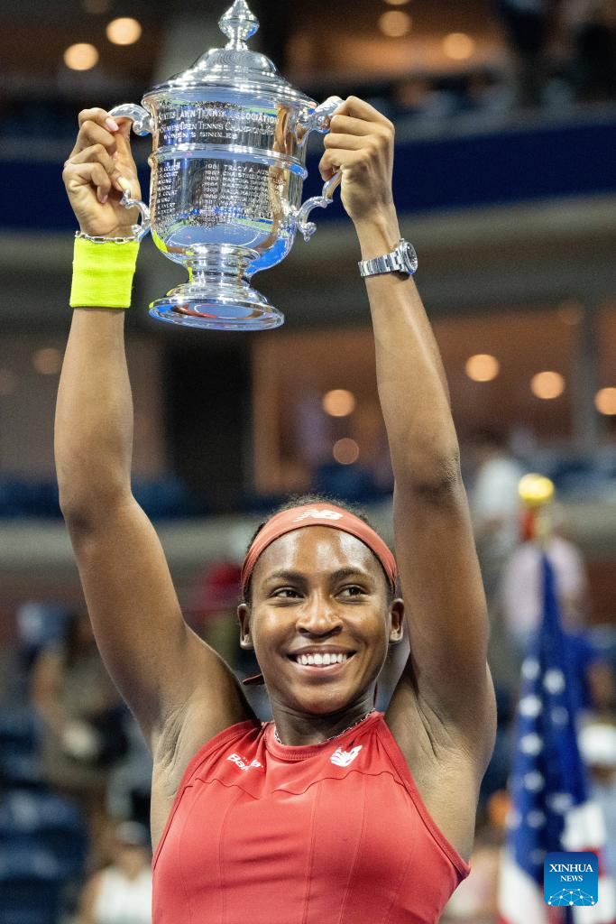 Coco Gauff of the United States celebrates during the awarding ceremony for the women's singles at the 2023 US Open tennis championships in New York, the United States, on Sept. 9, 2023. (Xinhua/Liu Jie)
