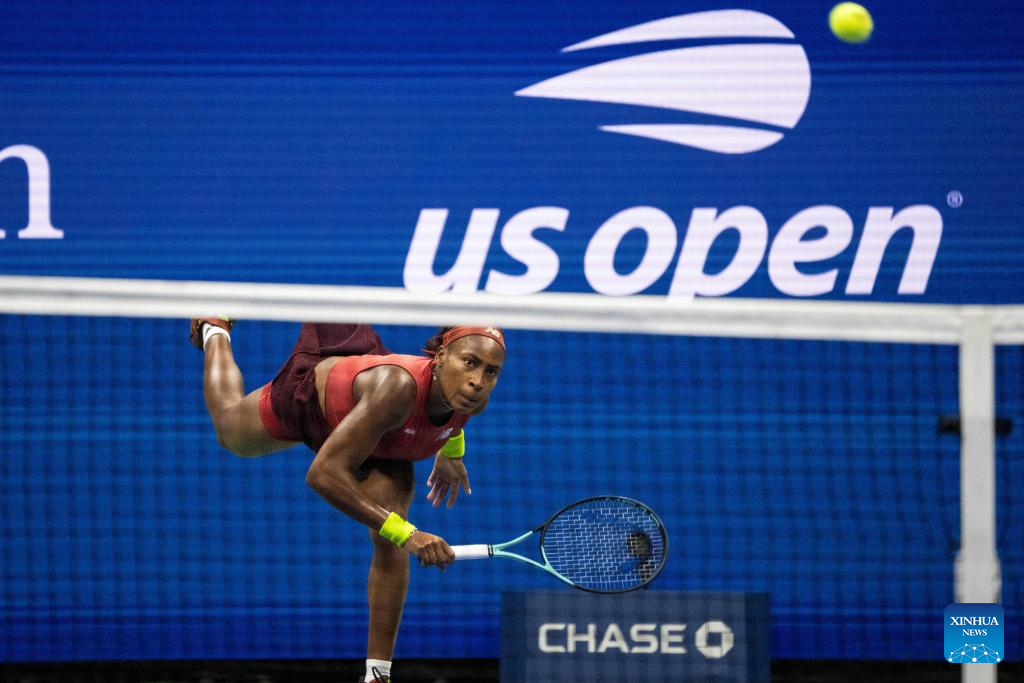 Coco Gauff of the United States serves during the women's singles final match against Aryna Sabalenka of Belarus at the 2023 US Open tennis championships in New York, the United States, on Sept. 9, 2023. (Xinhua/Liu Jie)