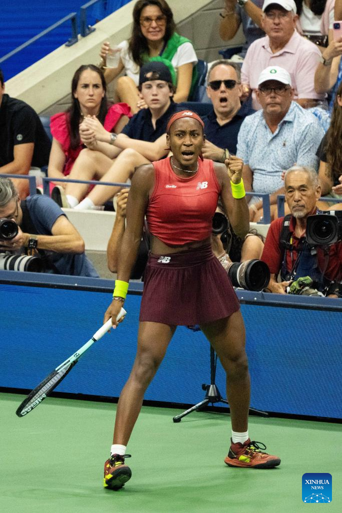Coco Gauff of the United States reacts during the women's singles final match against Aryna Sabalenka of Belarus at the 2023 US Open tennis championships in New York, the United States, on Sept. 9, 2023. (Xinhua/Liu Jie)