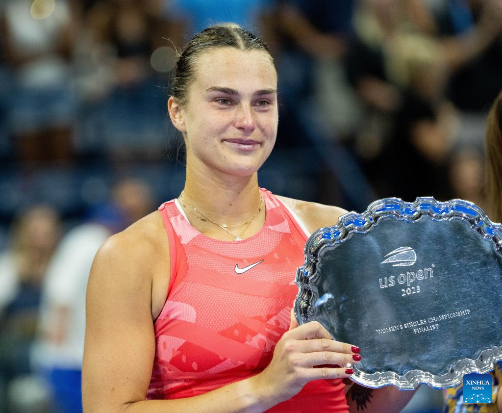 Aryna Sabalenka of Belarus celebrates during the awarding ceremony for the women's singles at the 2023 US Open tennis championships in New York, the United States, on Sept. 9, 2023. (Xinhua/Liu Jie)