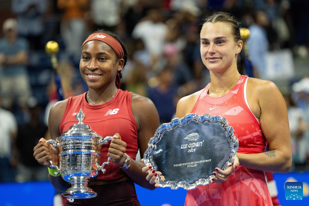 Coco Gauff (L) of the United States and Aryna Sabalenka of Belarus pose for photos during the awarding ceremony for the women's singles at the 2023 US Open tennis championships in New York, the United States, on Sept. 9, 2023. (Xinhua/Liu Jie)