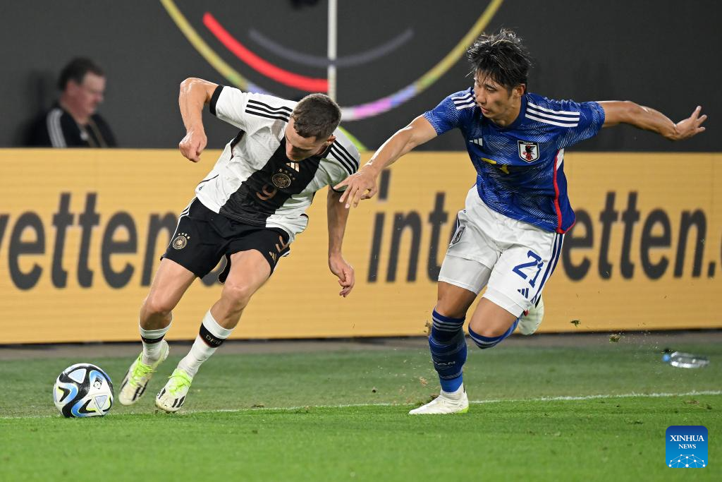 Florian Wirtz (L) of Germany vies with Ito Hiroki of Japan during a friendly match between Germany and Japan in Wolfsburg, Germany, Sept. 9, 2023. (Photo by Ulrich Hufnagel/Xinhua)