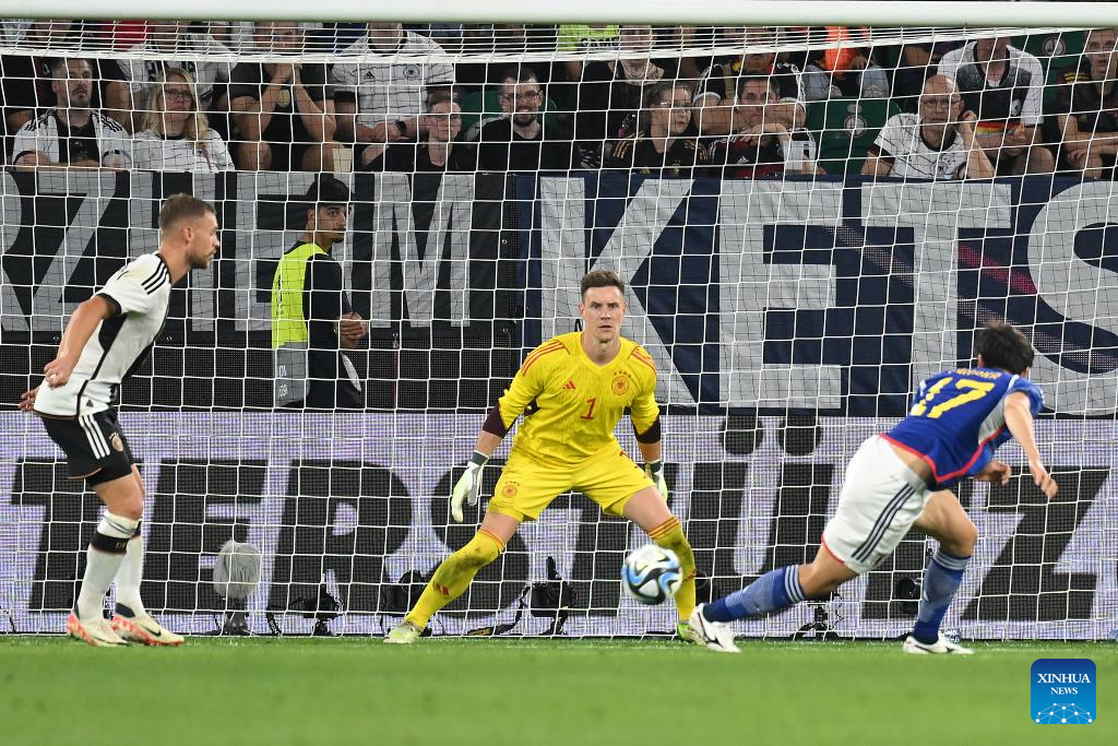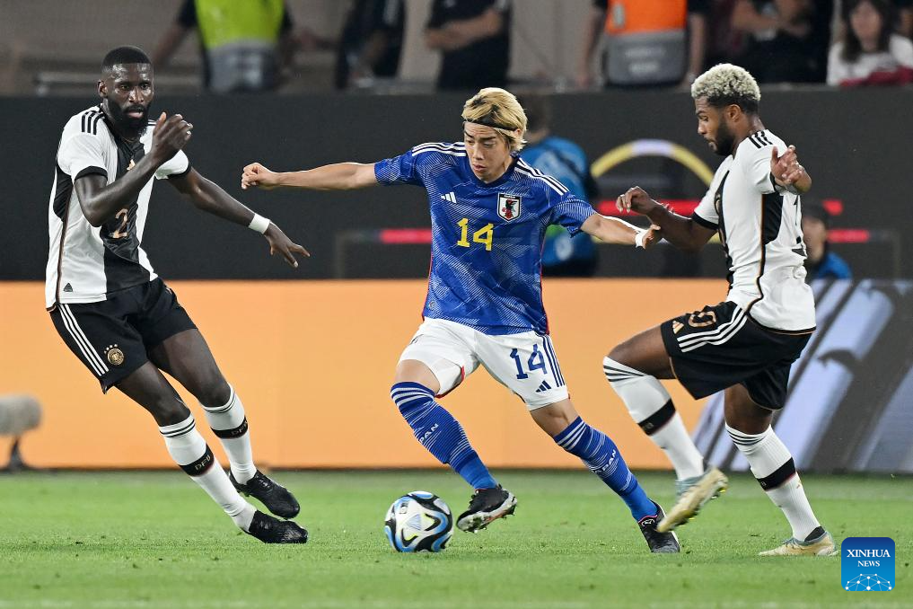 Antonio Ruediger (L) and Serge Gnabry (R) of Germany vie with Ito Junya of Japan a friendly match between Germany and Japan in Wolfsburg, Germany, Sept. 9, 2023. (Photo by Ulrich Hufnagel/Xinhua)