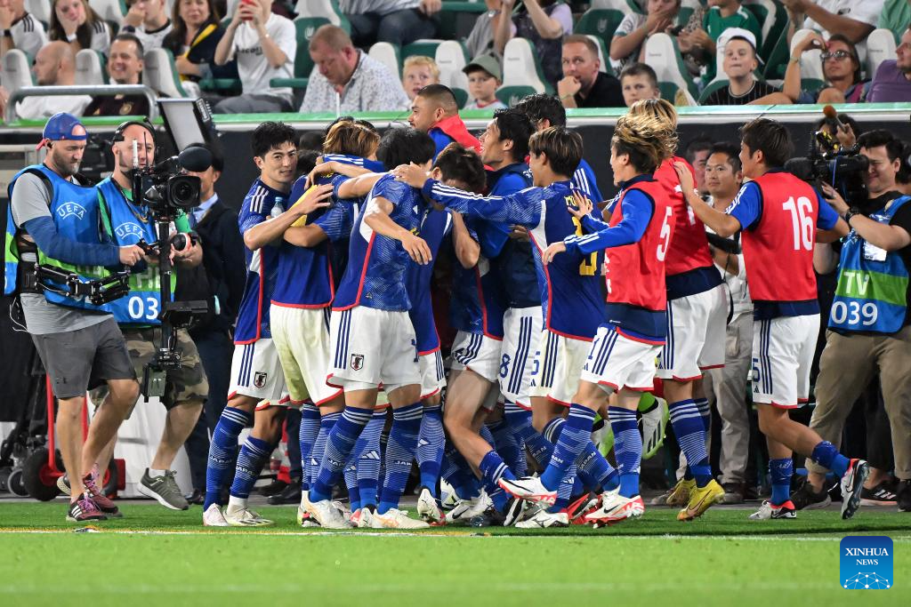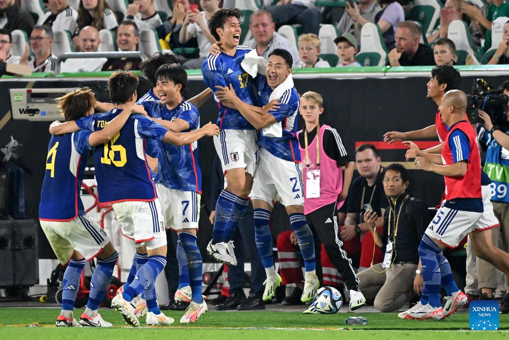 Players of Japan celebrate victory after winning a friendly match between Germany and Japan in Wolfsburg, Germany, Sept. 9, 2023. (Photo by Ulrich Hufnagel/Xinhua)