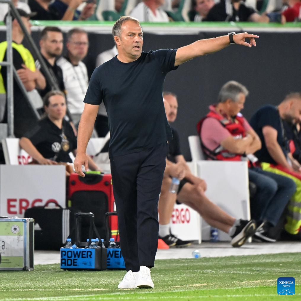 Hans-Dieter Flick, coach of Germany, instructs his players during a friendly match between Germany and Japan in Wolfsburg, Germany, Sept. 9, 2023. (Photo by Ulrich Hufnagel/Xinhua)