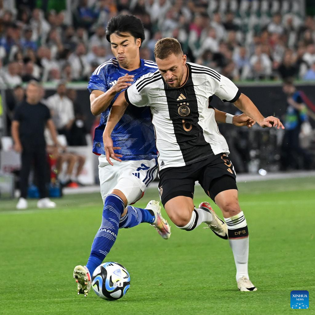 Julian Brandt (L) of Germany vies with Kubo Takefusa of Japan a friendly match between Germany and Japan in Wolfsburg, Germany, Sept. 9, 2023. (Photo by Ulrich Hufnagel/Xinhua)