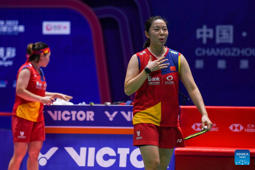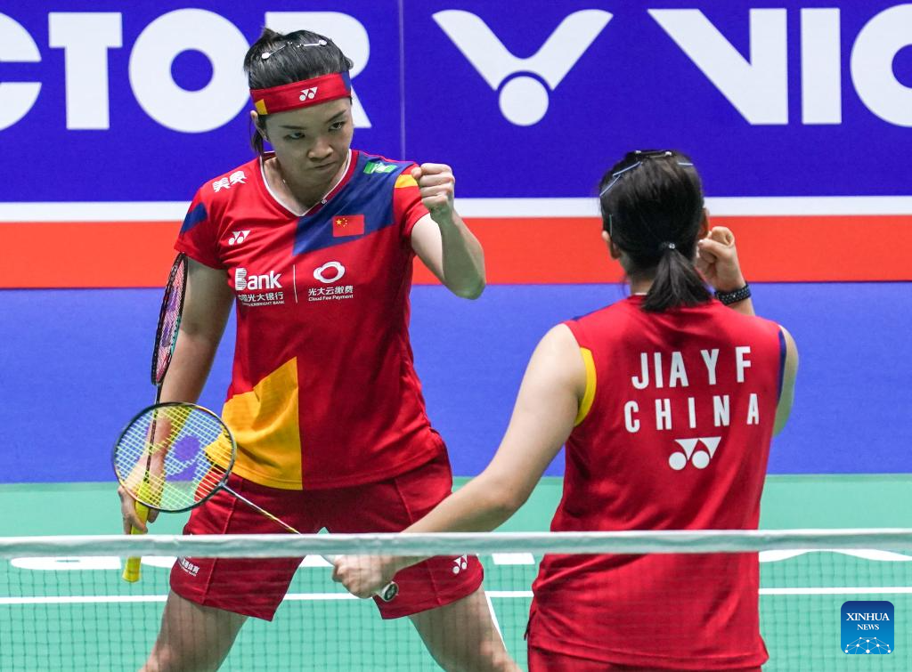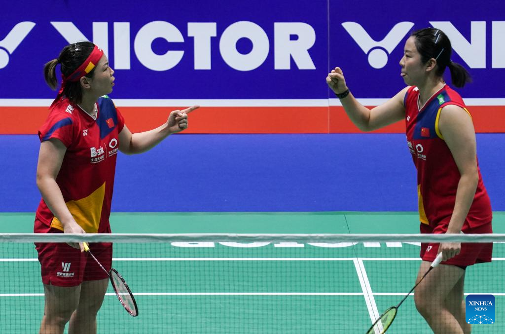Chen Qingchen (L)/Jia Yifan of China react during the women's doubles final between Chen Qingchen/Jia Yifan of China and Baek Ha Na/Lee So Hee of South Korea at the 2023 China Open badminton tournament in Changzhou, east China's Jiangsu Province, Sept. 10, 2023. (Xinhua/Yang Lei)