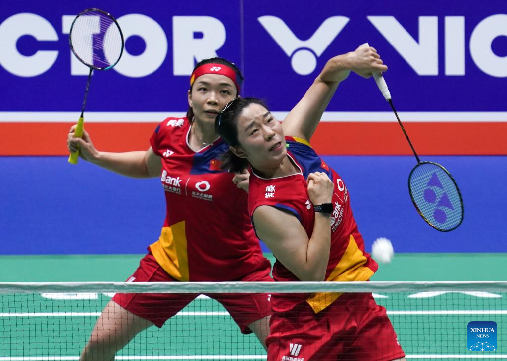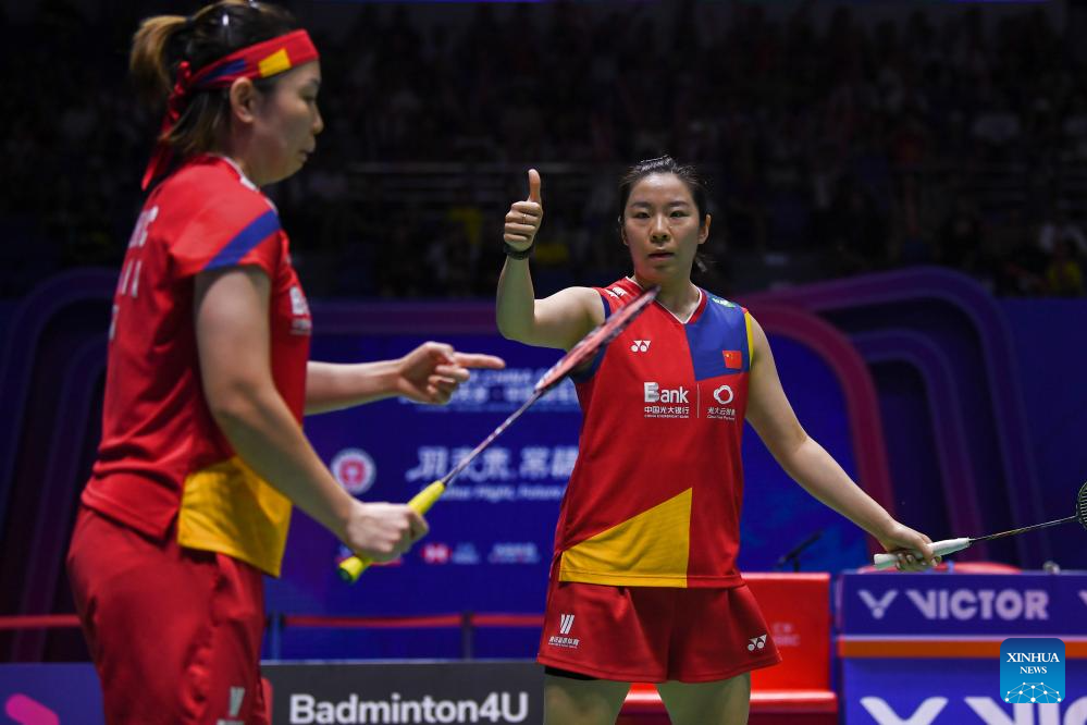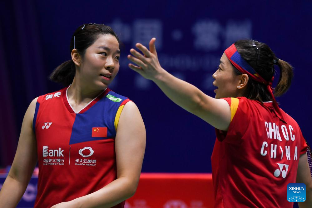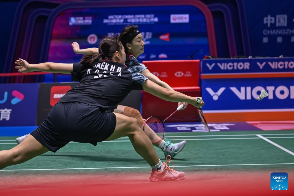 Chen Qingchen/Jia Yifan (R) of China compete during the women's doubles final between Chen Qingchen/Jia Yifan of China and Baek Ha Na/Lee So Hee of South Korea at the 2023 China Open badminton tournament in Changzhou, east China's Jiangsu Province, Sept. 10, 2023. (Xinhua/Yang Lei)