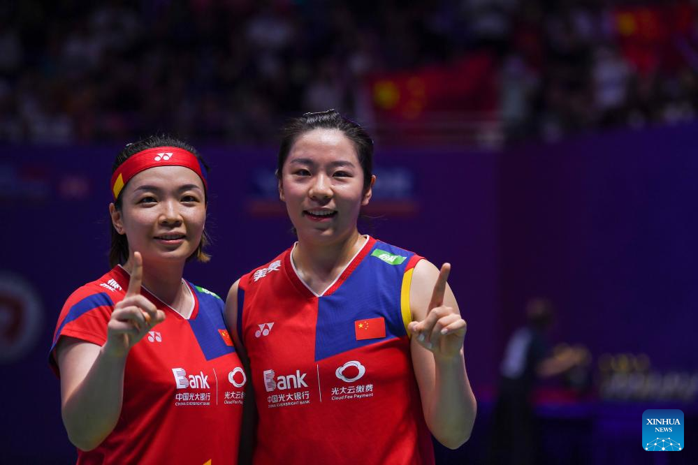 Chen Qingchen/Jia Yifan (R) of China celebrate after the women's doubles final between Chen Qingchen/Jia Yifan of China and Baek Ha Na/Lee So Hee of South Korea at the 2023 China Open badminton tournament in Changzhou, east China's Jiangsu Province, Sept. 10, 2023. (Xinhua/Li Bo)