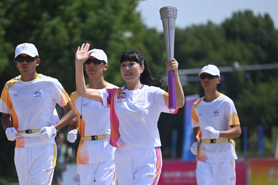 Wang Yilyu, China's badminton mixed doubles champion at the Tokyo Olympics, was the first torchbearer in Jiaxing. "After receiving the torch, I couldn't calm down for a long time," he said. Wang hopes for more opportunities to contribute to the development of sports in the future.