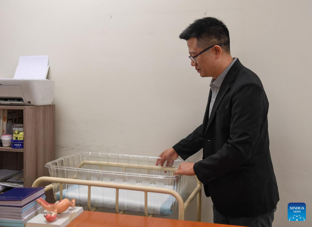 Taylor Zhang arranges a temporary bed for infants, which is designated for mothers seeking for medical consultation with infants, in Gaborone, Botswana, Sept. 11, 2023. It is 9 o'clock on a Monday morning, and people have been lining up at the waiting room of Taylor Zhang's obstetrics & gynecology clinic of a private hospital in Gaborone, the capital of Botswana.