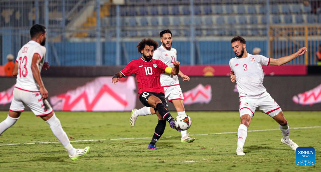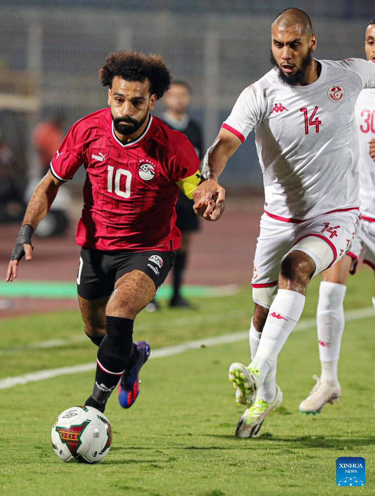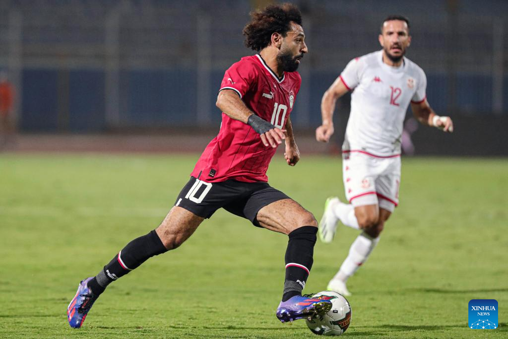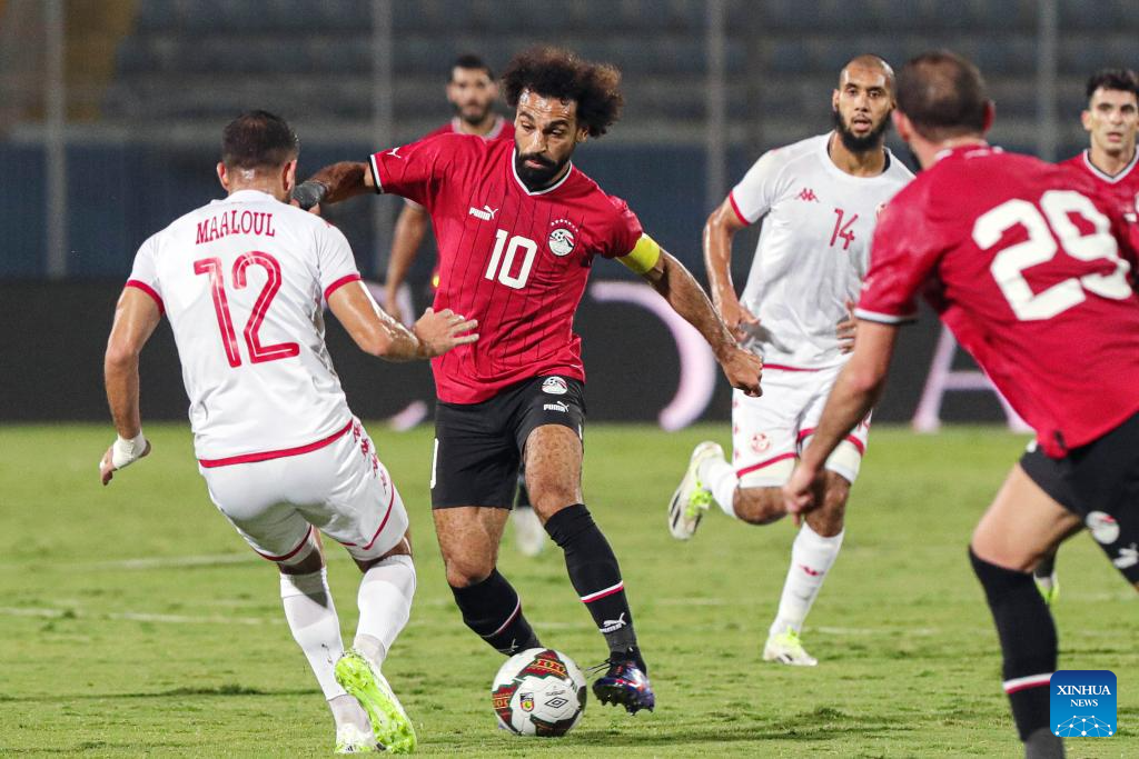 Mohamed Salah (L) of Egypt competes during the international friendly match between Egypt and Tunisia in Cairo, Egypt, Sept. 12, 2023. (Xinhua/Ahmed Gomaa)