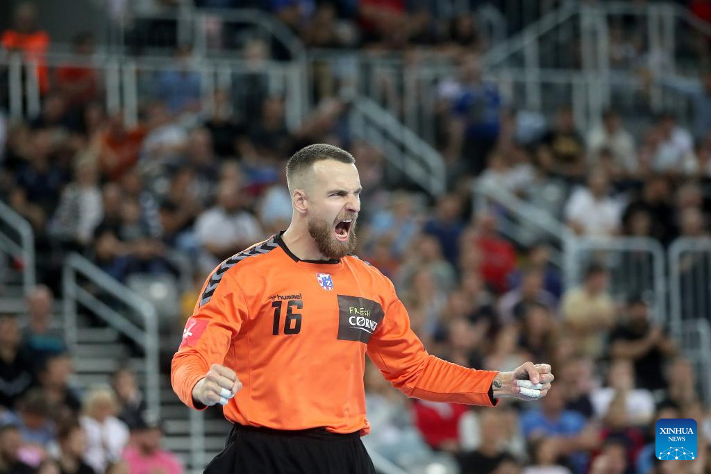 RK Zagreb Golakeeper Aljaz Panjtar reacts during the EHF Champions League match between RK Zagreb and THW Kiel in Zagreb, Croatia, on Sept. 14, 2023. (Photo by Slavko Midzor/PIXSELL via Xinhua)