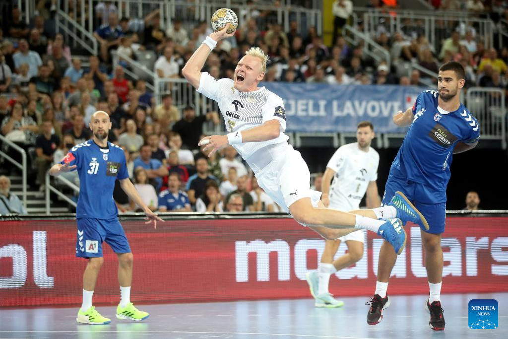 Patrick Wiencek (2nd L) of THW Kiel shoots the ball during the EHF Champions League match between RK Zagreb and THW Kiel in Zagreb, Croatia, on Sept. 14, 2023. (Photo by Slavko Midzor/PIXSELL via Xinhua)