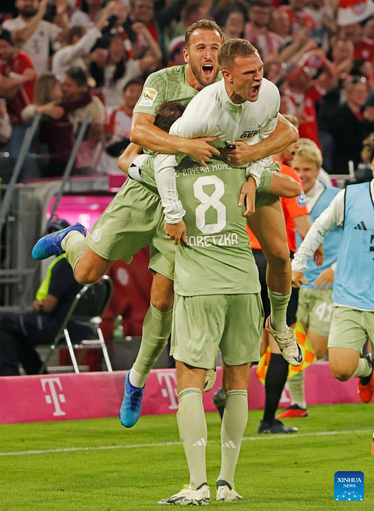 Leon Goretzka (bottom) of Bayern Munich celebrates scoring with his teammates Harry Kane (top L) and Joshua Kimmich during a German first division Bundesliga football match in Munich, Germany, Sept. 15, 2023. (Photo by Philippe Ruiz/Xinhua)