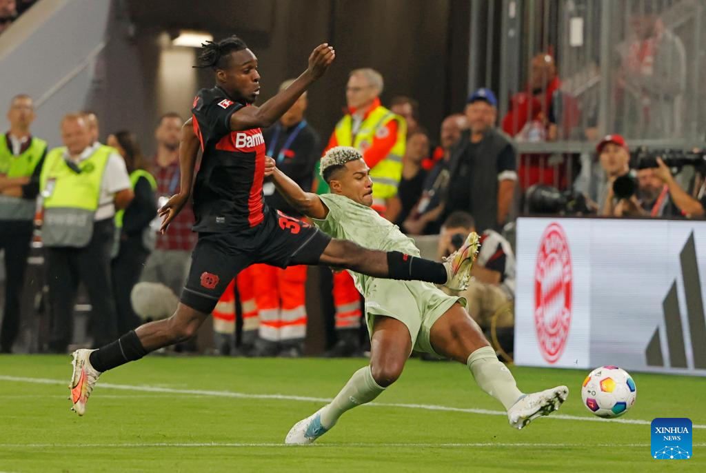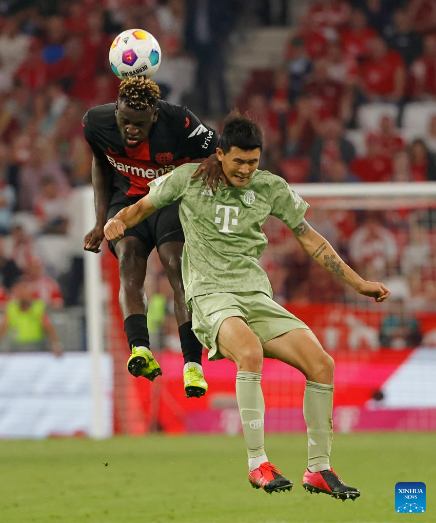 Victor Boniface (L) of Leverkusen vies with Kim Min-Jae of Bayern Munich during a German first division Bundesliga football match in Munich, Germany, Sept. 15, 2023. (Photo by Philippe Ruiz/Xinhua)