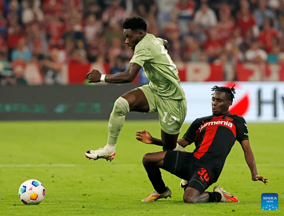 Alphonso Davies (L) of Bayern Munich vies with Jeremie Frimpong of Leverkusen during a German first division Bundesliga football match in Munich, Germany, Sept. 15, 2023. (Photo by Philippe Ruiz/Xinhua)