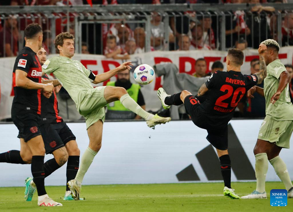 Thomas Mueller (3rd L) of Bayern Munich vies with Alejandro Grimaldo (2nd R) of Leverkusen during a German first division Bundesliga football match in Munich, Germany, Sept. 15, 2023. (Photo by Philippe Ruiz/Xinhua)