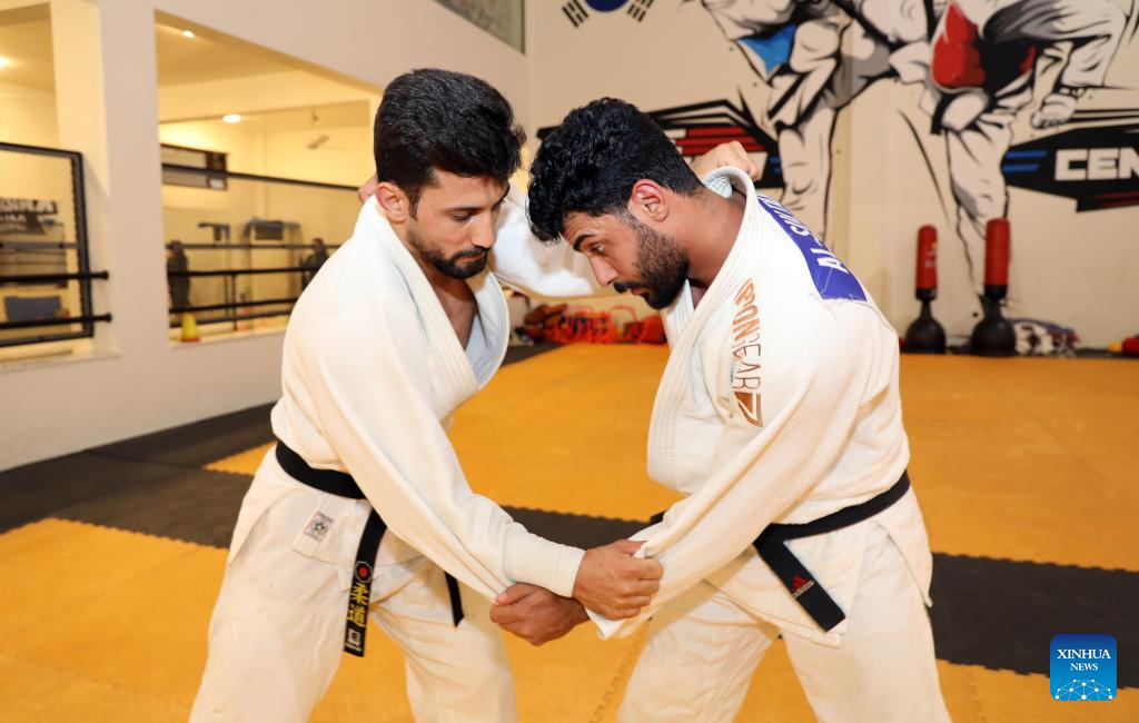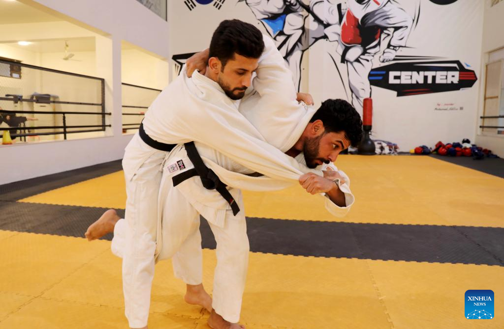 Athletes of the Iraqi judo team train in preparation for Hangzhou Asian Games at the Baghdad Sports Center in Baghdad, Iraq, Sept. 14, 2023. (Xinhua/Khalil Dawood)