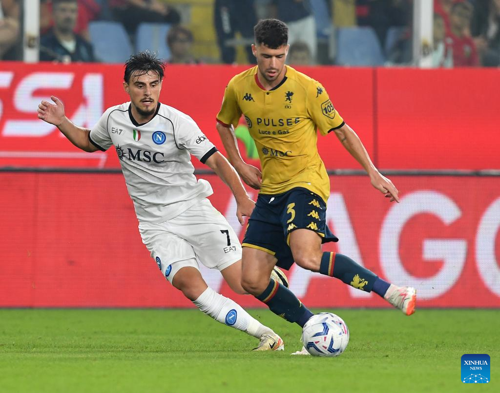 Napoli's Victor Osimhen (R) vies with Genoa's Radu Dragusin during a Serie A football match between Genoa and Napoli in Genova, Italy, on Sept. 16, 2023. (Photo by Augusto Casasoli/Xinhua)