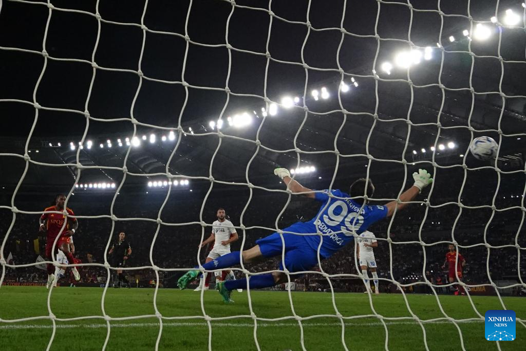 Roma's Romelu Lukaku scores his goal during a Serie A football match between Roma and Empoli in Rome, Italy, on Sept.17, 2023. (Photo by Alberto Lingria/Xinhua)