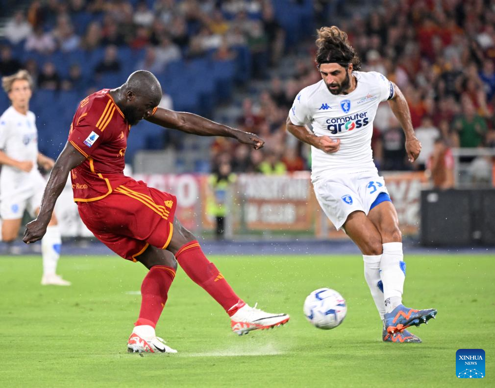 Roma's Romelu Lukaku (L) vies with Empoli's Sebastiano Luperto during a Serie A football match between Roma and Empoli in Rome, Italy, on Sept.17, 2023. (Photo by Alberto Lingria/Xinhua)