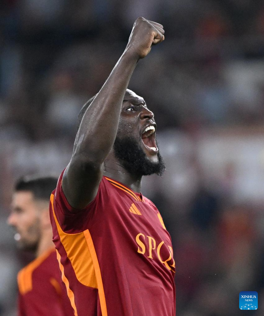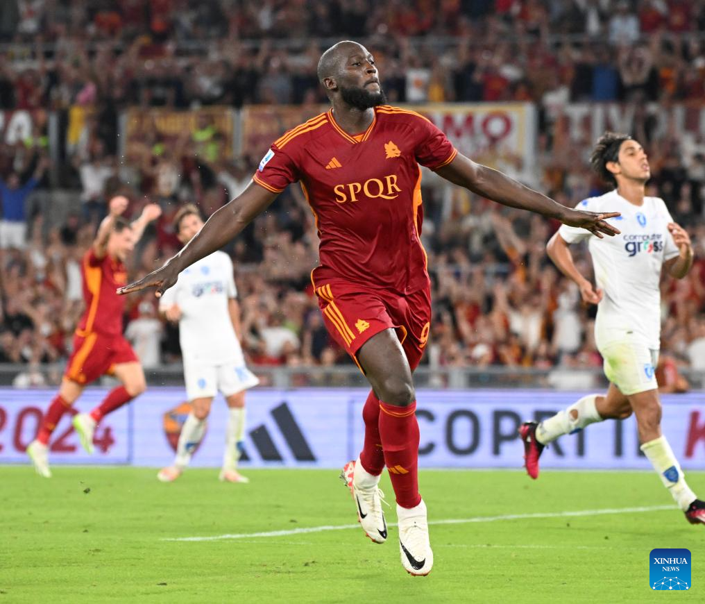 Roma's Romelu Lukaku celebrates his goal during a Serie A football match between Roma and Empoli in Rome, Italy, on Sept.17, 2023. (Photo by Alberto Lingria/Xinhua)