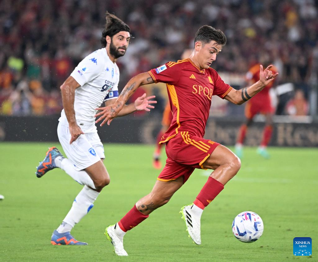 Roma's Paulo Dybala (R) breaks through during a Serie A football match between Roma and Empoli in Rome, Italy, on Sept.17, 2023. (Photo by Alberto Lingria/Xinhua)