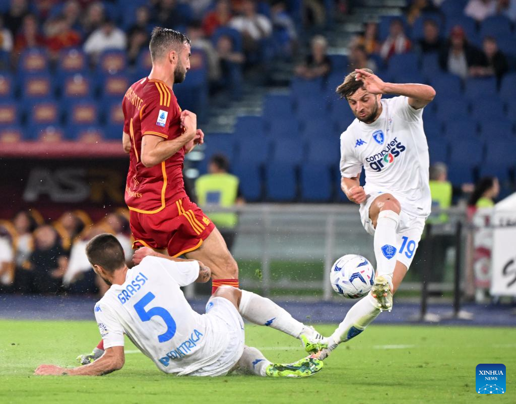 Empoli's Alberto Grassi (front) scores the own goal during a Serie A football match between Roma and Empoli in Rome, Italy, on Sept.17, 2023. (Photo by Alberto Lingria/Xinhua)