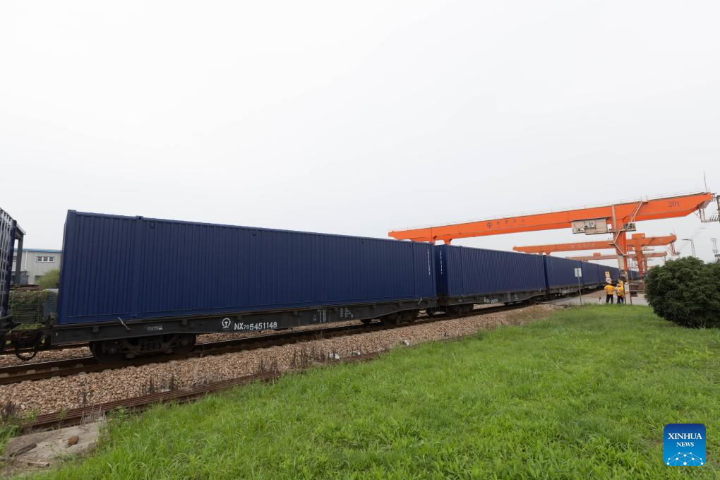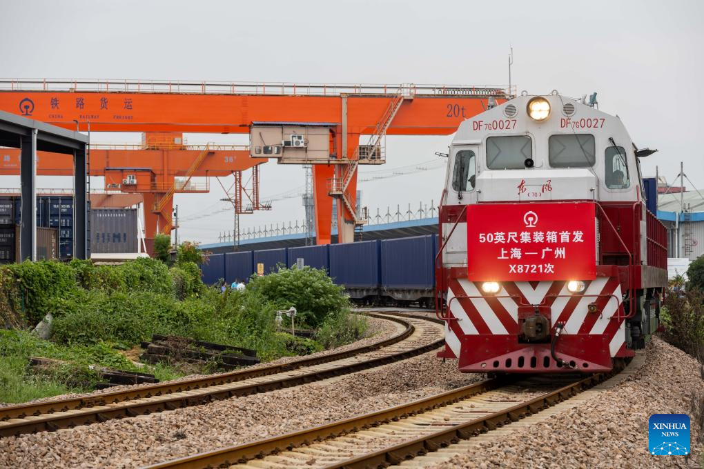 An intermodal express train loaded with 50-foot containers departs for Dongguan of south China's Guangdong Province at Minhang Railway Station in east China's Shanghai on Sept. 20, 2023. Intermodal express trains loaded with 50-foot containers respectively departed from Shanghai, Guangzhou of south China's Guangdong Province, Changsha of central China's Hunan Province and Kunming of southwest China's Yunnan Province on Wednesday, joining force of regular freight train service. The 50-foot containers are independently developed by China State Railway Group Co., Ltd. (China Railway), each with a weight of 36 tonnes and a load capacity of 30.85 tonnes. The volume of these containers reaches 114.4 cubic meters, a 50 percent increase over that of 40-foot international standard containers, making them the largest containers by volume that have been put into use in China by far. (Xinhua/Wang Xiang)