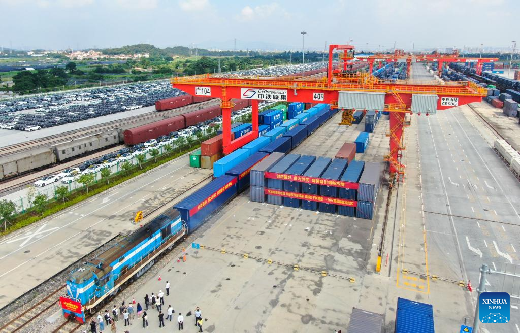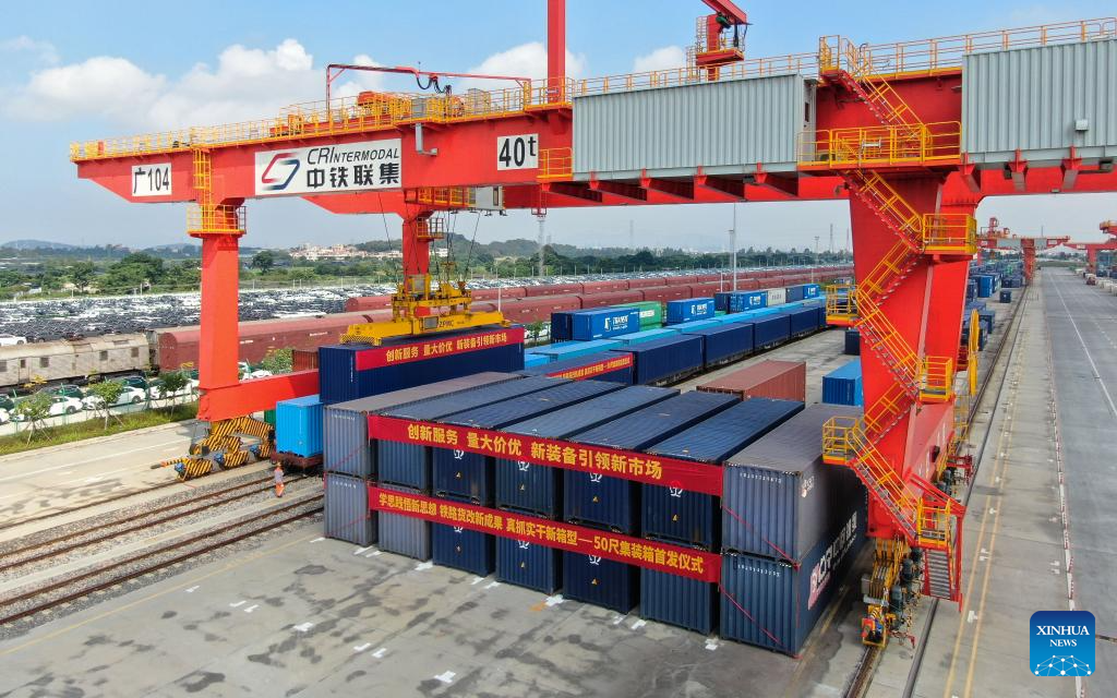 An intermodal express train loaded with 50-foot containers departs for Changsha of central China's Hunan Province at Guangzhou International Port Railway Station in Guangzhou, south China's Guangdong Province on Sept. 20, 2023. Intermodal express trains loaded with 50-foot containers respectively departed from east China's Shanghai, Guangzhou, Changsha of central China's Hunan Province and Kunming of southwest China's Yunnan Province on Wednesday, joining force of regular freight train service. The 50-foot containers are independently developed by China State Railway Group Co., Ltd. (China Railway), each with a weight of 36 tonnes and a load capacity of 30.85 tonnes. The volume of these containers reaches 114.4 cubic meters, a 50 percent increase over that of 40-foot international standard containers, making them the largest containers by volume that have been put into use in China by far. (Xinhua/Deng Hua)