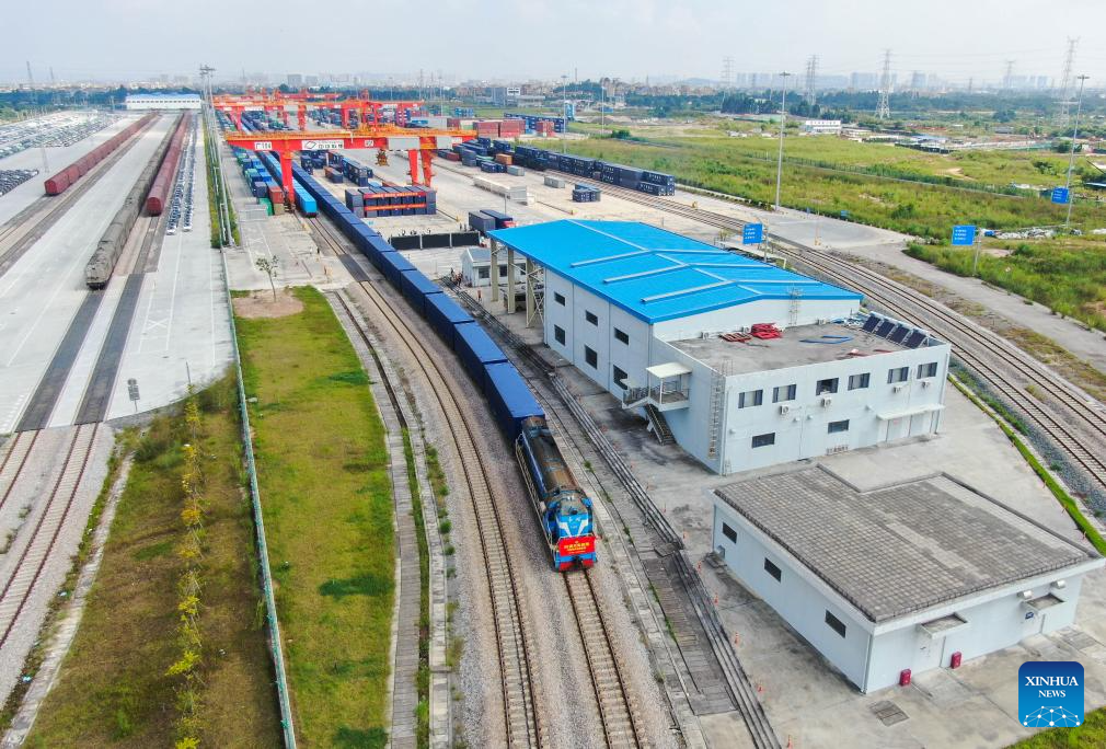 This aerial photo taken on Sept. 20, 2023 shows an intermodal express train loaded with 50-foot containers departing for Changsha of central China's Hunan Province at Guangzhou International Port Railway Station in Guangzhou, south China's Guangdong Province. Intermodal express trains loaded with 50-foot containers respectively departed from east China's Shanghai, Guangzhou, Changsha of central China's Hunan Province and Kunming of southwest China's Yunnan Province on Wednesday, joining force of regular freight train service. The 50-foot containers are independently developed by China State Railway Group Co., Ltd. (China Railway), each with a weight of 36 tonnes and a load capacity of 30.85 tonnes. The volume of these containers reaches 114.4 cubic meters, a 50 percent increase over that of 40-foot international standard containers, making them the largest containers by volume that have been put into use in China by far. (Xinhua/Deng Hua)