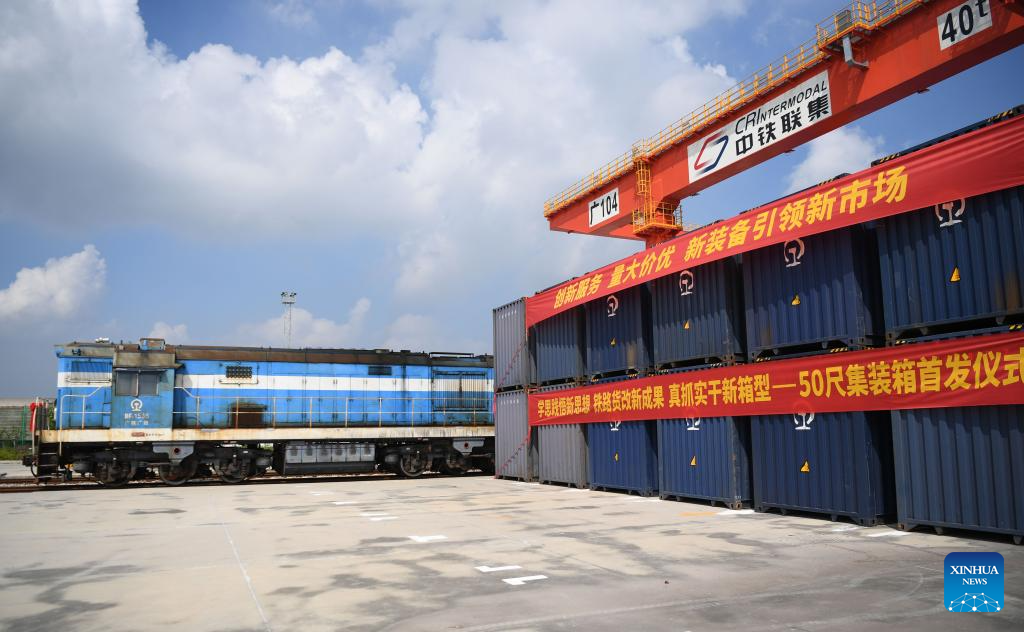 This photo taken on Sept. 20, 2023 shows an intermodal express train loaded with 50-foot containers at Guangzhou International Port Railway Station in Guangzhou, south China's Guangdong Province. Intermodal express trains loaded with 50-foot containers respectively departed from east China's Shanghai, Guangzhou, Changsha of central China's Hunan Province and Kunming of southwest China's Yunnan Province on Wednesday, joining force of regular freight train service. The 50-foot containers are independently developed by China State Railway Group Co., Ltd. (China Railway), each with a weight of 36 tonnes and a load capacity of 30.85 tonnes. The volume of these containers reaches 114.4 cubic meters, a 50 percent increase over that of 40-foot international standard containers, making them the largest containers by volume that have been put into use in China by far. (Xinhua/Deng Hua)
