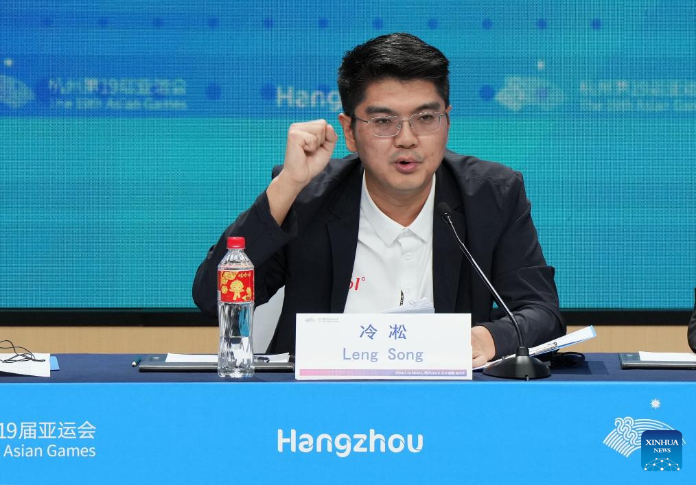 Li Yiqing (C), Spokesperson for the Hangzhou Asian Games Opening and Closing Ceremonies Operations Centre, speaks at a press conference on the preparations for the opening ceremony of the Hangzhou Asian Games in Hangzhou, east China's Zhejiang Province, Sept. 21, 2023. (Xinhua/Li Yibo)