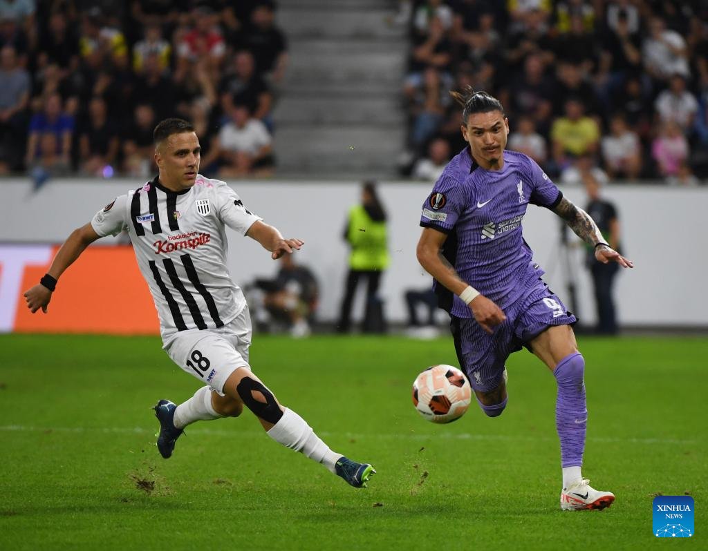Darwin Nunez (R) of Liverpool vies with Branko Jovicic of LASK Linz during the 2023/2024 UEFA Europa League Group E match between LASK Linz and Liverpool in Linz, Austria, on Sept. 21, 2023. (Xinhua/He Canling)