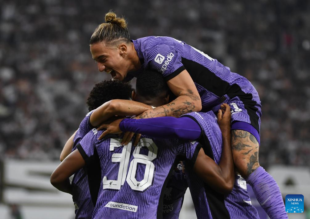 Players of Liverpool celebrate after scoring during the 2023/2024 UEFA Europa League Group E match between LASK Linz and Liverpool in Linz, Austria, on Sept. 21, 2023. (Xinhua/He Canling)