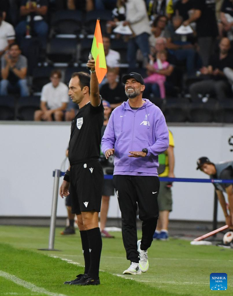 Liverpool head coach Jurgen Klopp (R) reacts during the 2023/2024 UEFA Europa League Group E match between LASK Linz and Liverpool in Linz, Austria, on Sept. 21, 2023. (Xinhua/He Canling)