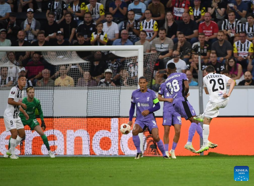 Florian Flecker (1st R) of LASK Linz shoots to score during the 2023/2024 UEFA Europa League Group E match between LASK Linz and Liverpool in Linz, Austria, on Sept. 21, 2023. (Xinhua/He Canling)