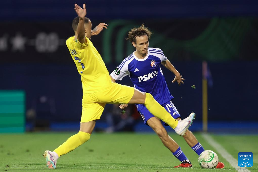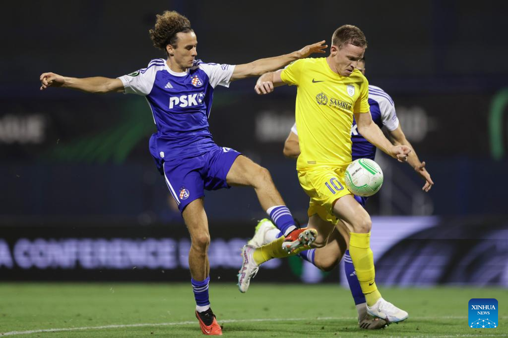 Robert Ljubicic (R) of Dinamo Zagreb vies with Maks Ebong of FC Astana during the 2023-2024 UEFA Europa Conference League group C match between Dinamo Zagreb of Croatia and FC Astana of Kazakhstan in Zagreb, Croatia, Sept. 21, 2023. (Luka Stanzl/PIXSELL via Xinhua)