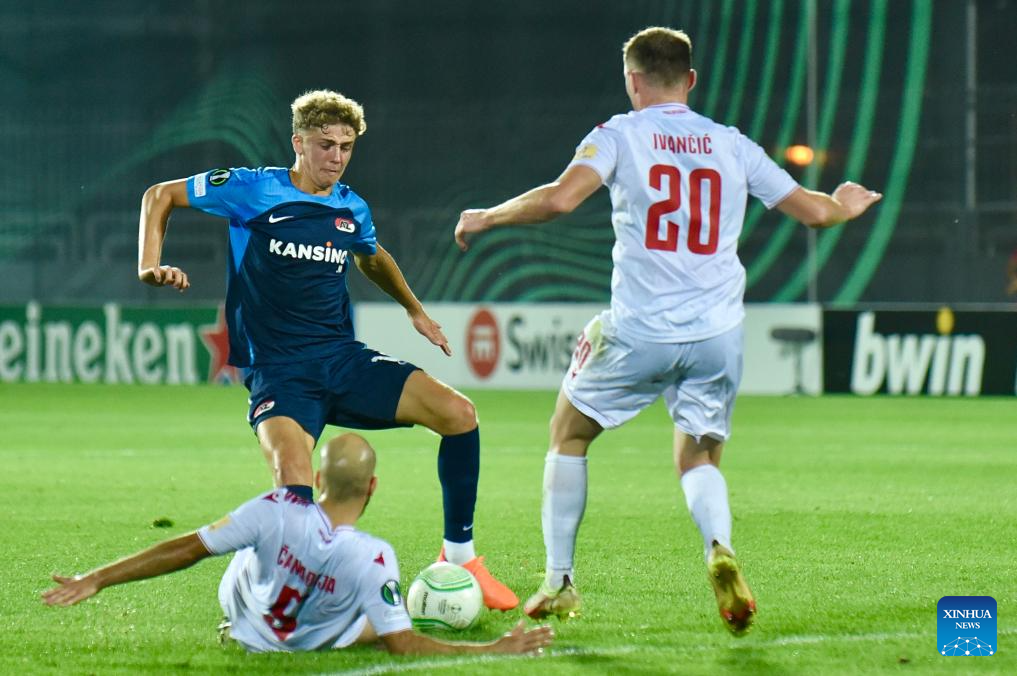 Sven Mijnans (L, top) of AZ Alkmaar breaks through during the 2023-2024 UEFA Europa Conference League group E match between Zrinjski of Bosnia and Herzegovina and AZ Alkmaar of the Netherlands in Mostar, Bosnia and Herzegovina, Sept. 21, 2023. (Xinhua/Ermin)